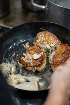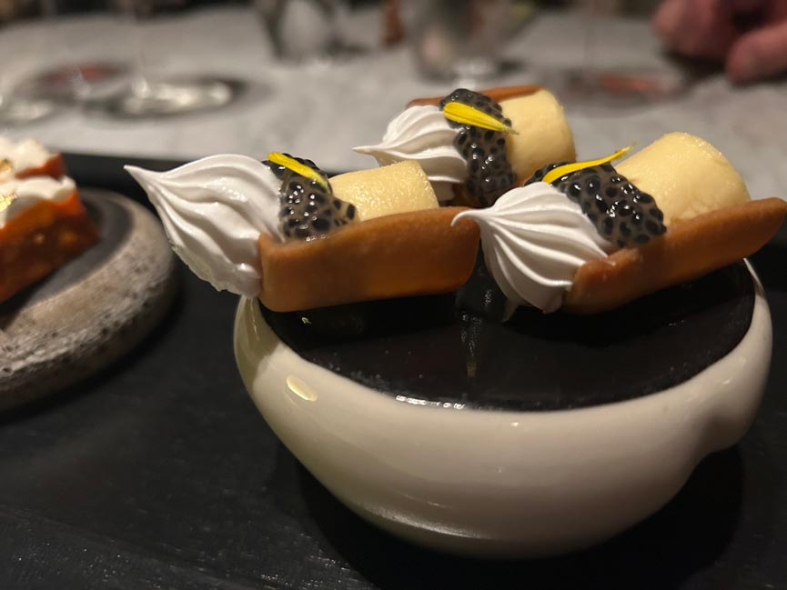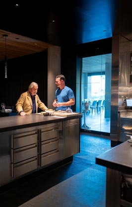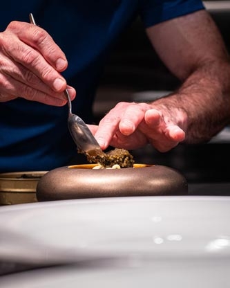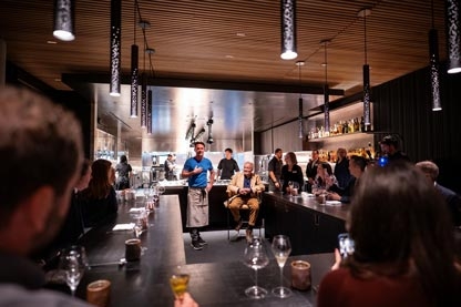 Engage with Jacques and the chefs as you sip wine, enjoy small plates, observe the courses being prepared and witness the spectacle of a bustling kitchen. The journey continues in the dining room with a succession of beautifully plated courses culminating with the final stop at the mysterious Chocolate Room for a parting gift of house-made chocolates.