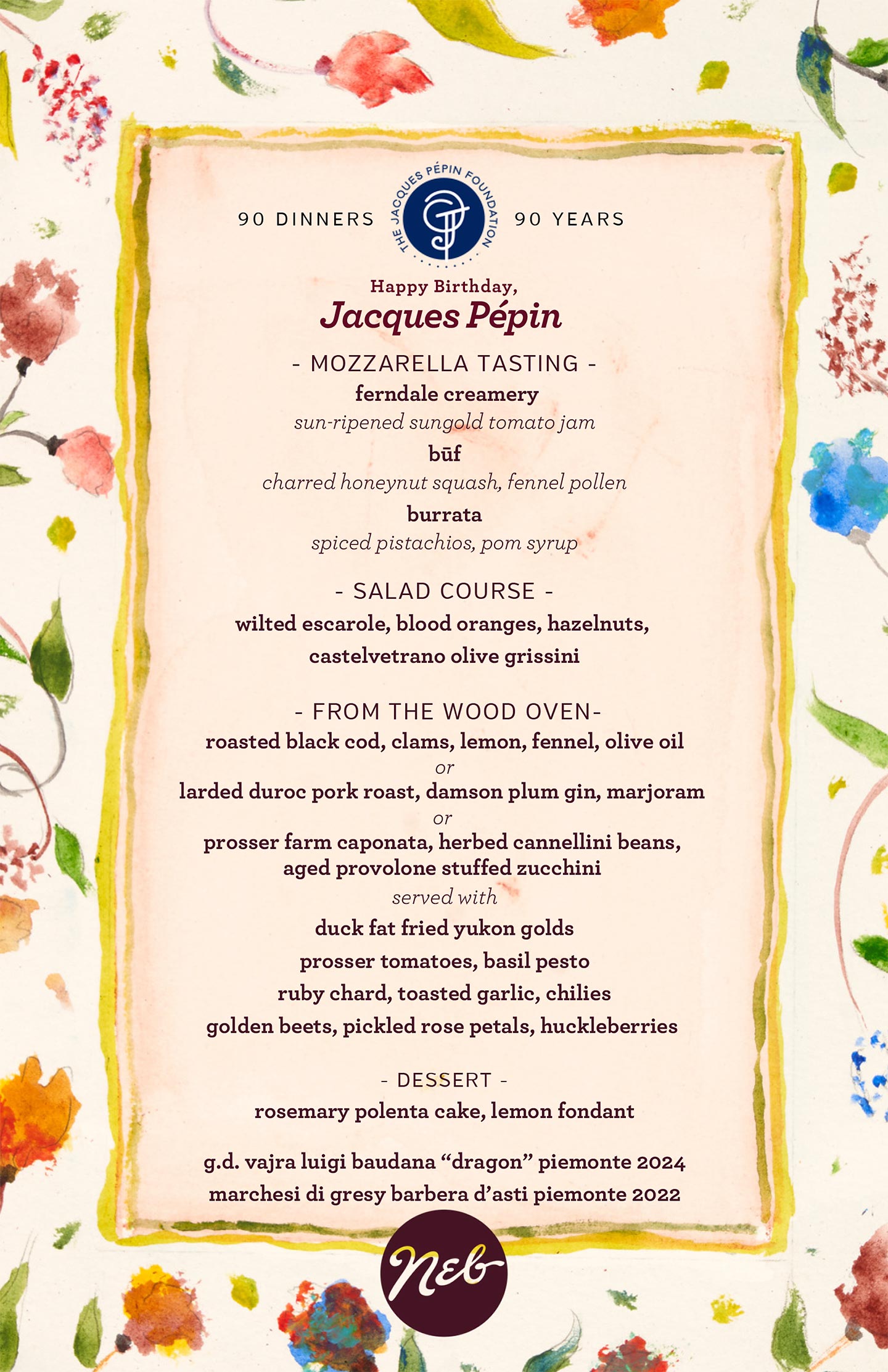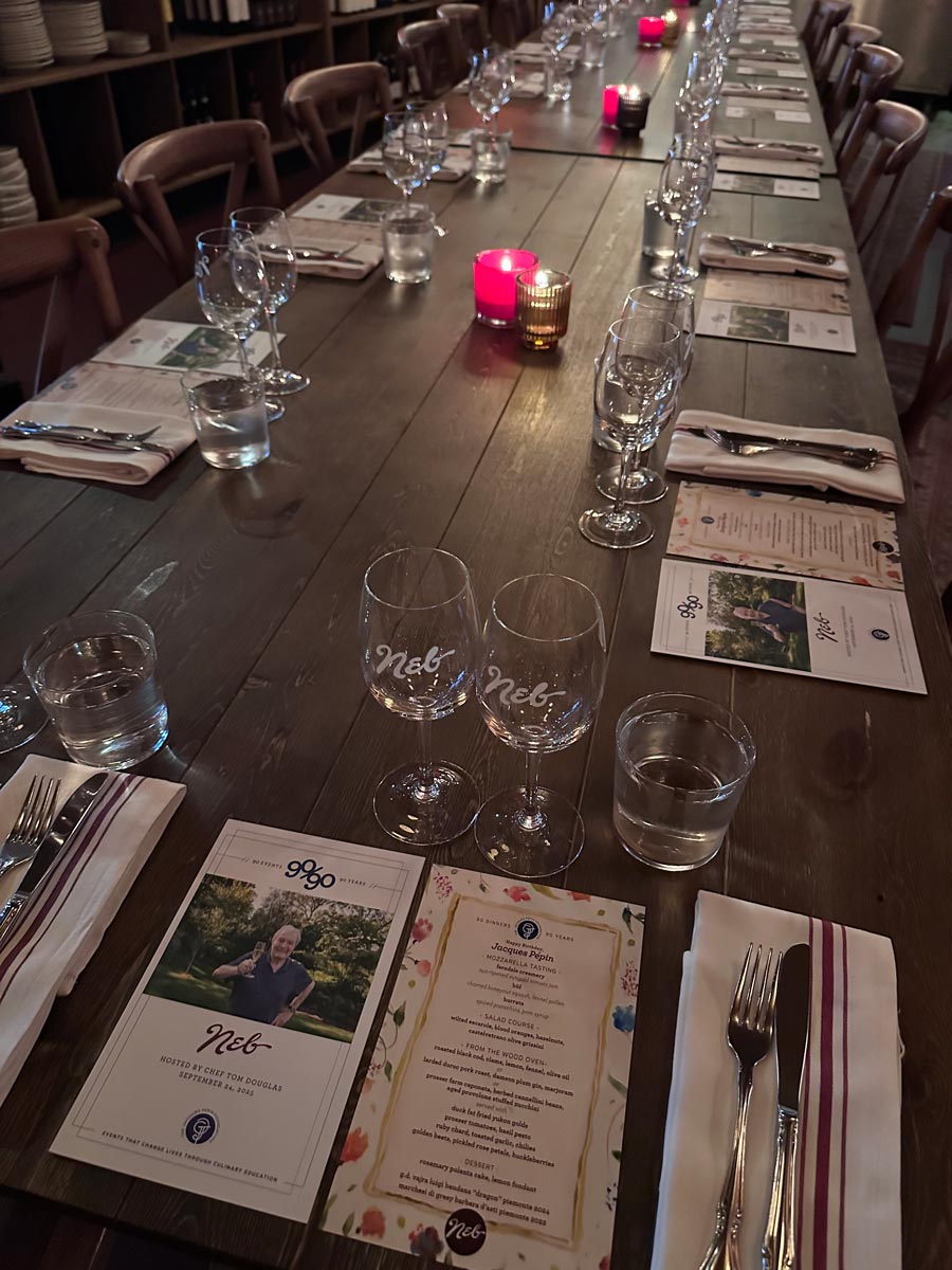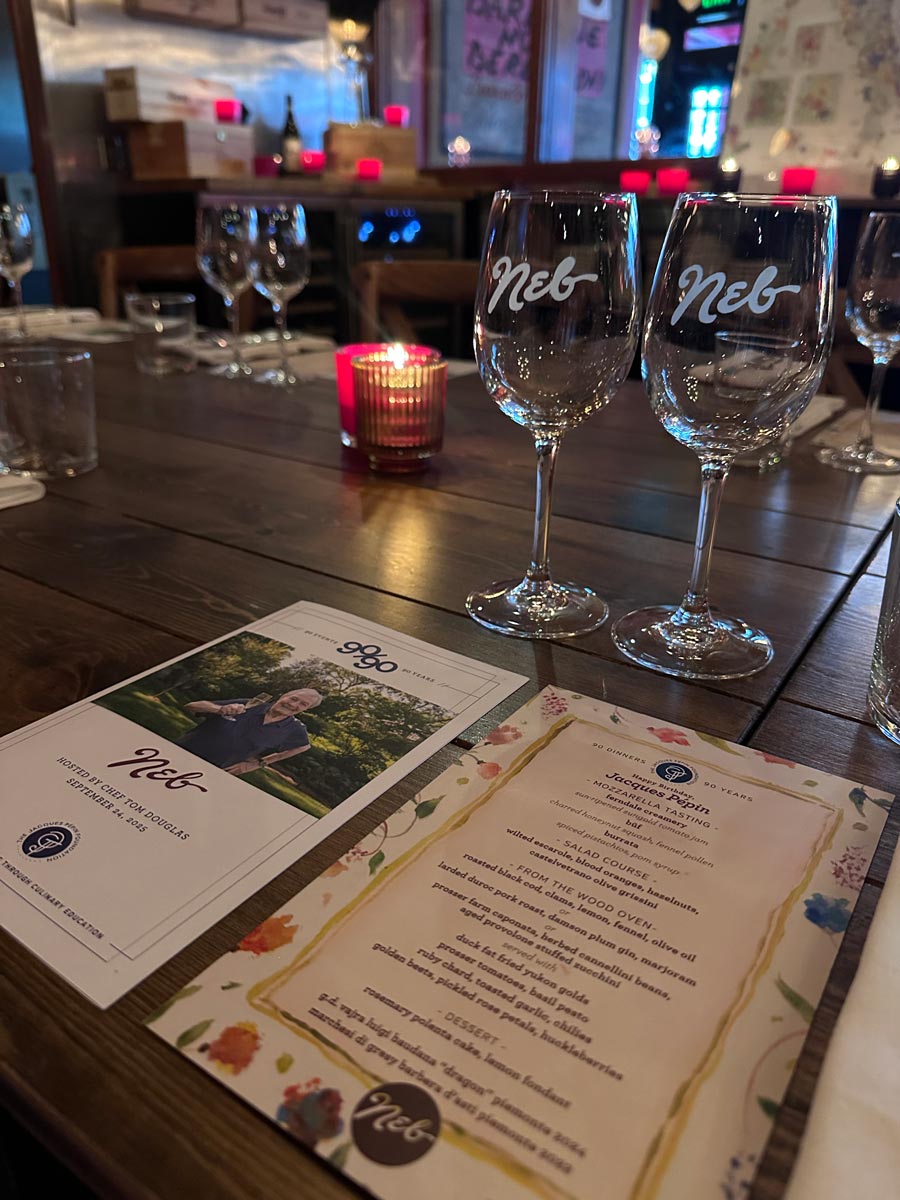 For this special 90/90 event, join Chef Douglas and the talented team at Neb for a generous family-style dinner celebrating the flavors of Italy and Jacques Pépin. Enjoy Tom’s mozzarella tasting, thoughtfully paired wines, warm hospitality, and a family-style feast to celebrate a great cause with good food, wine, and even better company.