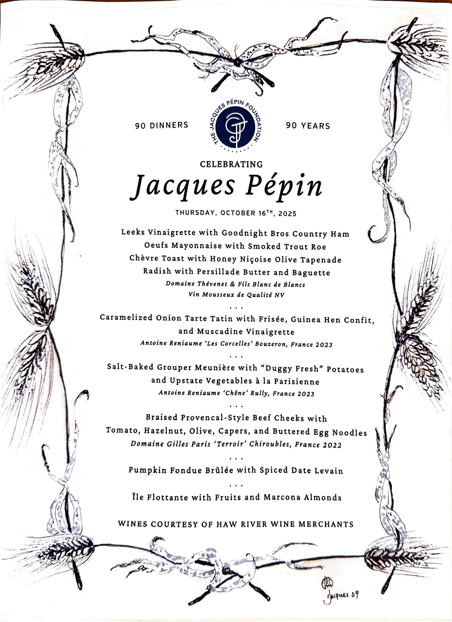 - Wine pairings included, and generously donated by Michael Tiano, proprietor of Haw River Wine Merchant — “In honor of Jacques Pépin, we will showcase wines from around his hometown of Bourg en Bresse, spotlighting the beautiful terroirs of the Macon, Beaujolais, and the Côte de Beaune. All of these wines are sourced from small, independent vignerons that represent the spirit of Southern Burgundy, while complementing the cuisine made famous by Chef Pépin” (Michael Tiano)
