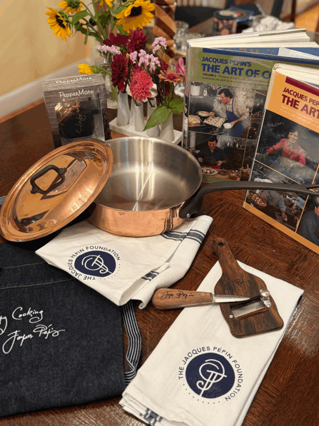 Included are some of the chef’s favorite tools, each infused with his culinary spirit: one of his beloved Mauviel copper sauté pans, an Island Creek oyster knife, an Urbani truffle slicer, a PepperMate pepper mill, a signed Chef Works embroidered apron, and two Jacques Pépin Foundation tea towels.